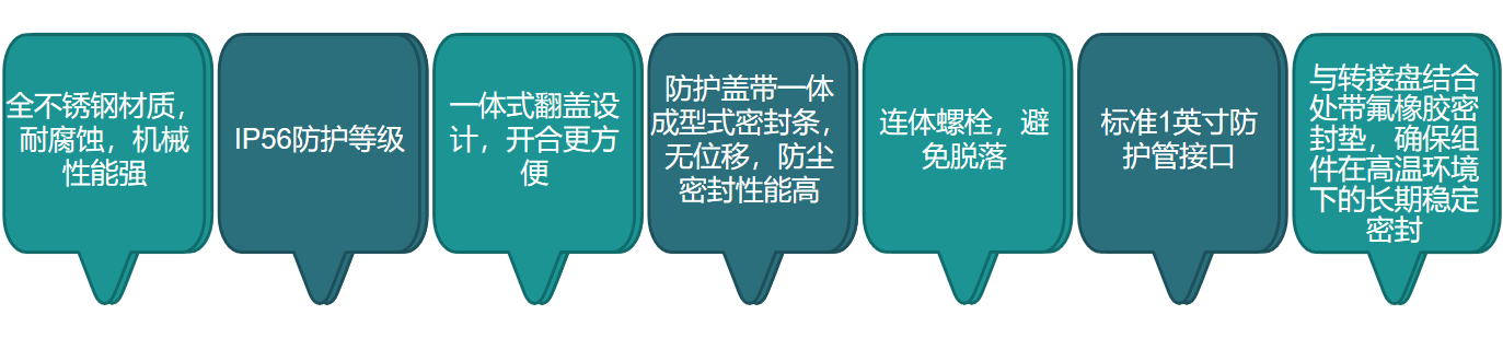 產(chǎn)品特點:不銹鋼一體式設計,IP56防護等級,長期穩(wěn)定密封,上蓋帶密封墊圈